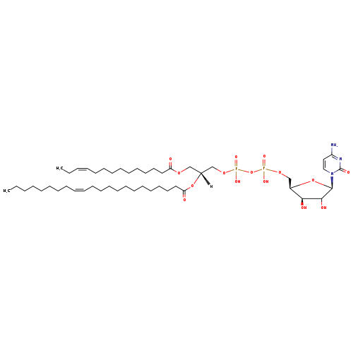 | YMDB12177 | CDP-DG(14:1(11Z)/24:1(11Z)) | {[(2R,3R,5R)-5-(4-amino-2-oxo-1,2-dihydropyrimidin-1-yl)-3,4-dihydroxyoxolan-2-yl]methoxy}({hydroxy[(2R)-2-[(11Z)-tetracos-11-enoyloxy]-3-[(11Z)-tetradec-11-enoyloxy]propoxy]phosphoryl}oxy)phosphinic acid | C50H89N3O15P2 1034.216 | |