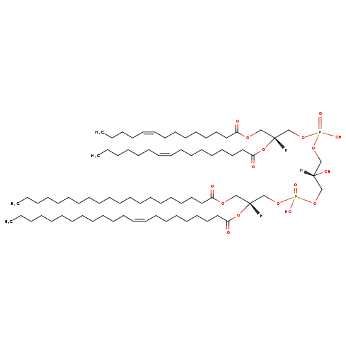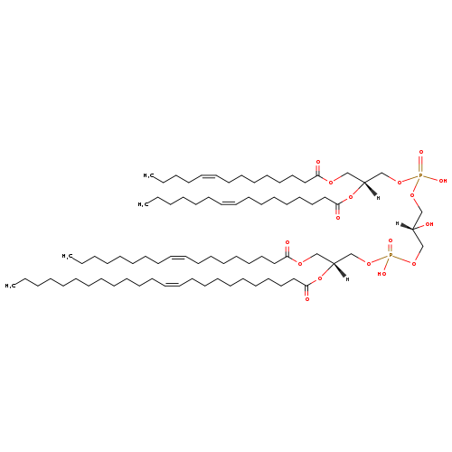 | YMDB09700 | CL(14:1(9Z)/16:1(9Z)/18:1(9Z)/24:1(9Z)) | [(2S)-3-({[(2R)-2-[(9Z)-hexadec-9-enoyloxy]-3-[(9Z)-tetradec-9-enoyloxy]propoxy](hydroxy)phosphoryl}oxy)-2-hydroxypropoxy][(2R)-3-[(9Z)-octadec-9-enoyloxy]-2-[(9Z)-tetracos-9-enoyloxy]propoxy]phosphinic acid | C81H150O17P2 1458.022 | |