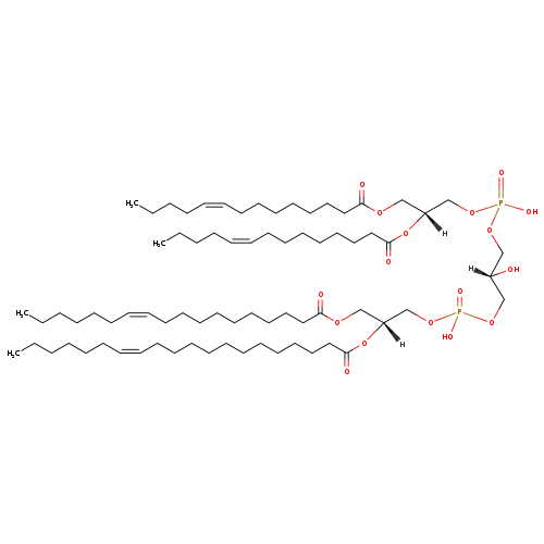 | YMDB09109 | CL(14:1(9Z)/14:1(9Z)/18:1(11Z)/20:0) | [(2R)-2,3-bis[(9Z)-tetradec-9-enoyloxy]propoxy][(2R)-2-hydroxy-3-({hydroxy[(2R)-2-(icosanoyloxy)-3-[(11Z)-octadec-11-enoyloxy]propoxy]phosphoryl}oxy)propoxy]phosphinic acid | C75H140O17P2 1375.876 | |
