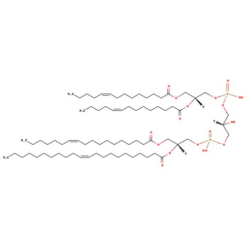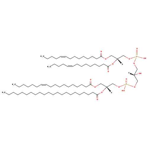 | YMDB09093 | CL(14:1(9Z)/14:1(9Z)/16:1(9Z)/28:1(11Z)) | [(2R)-2,3-bis[(9Z)-tetradec-9-enoyloxy]propoxy][(2R)-3-({[(2R)-3-[(9Z)-hexadec-9-enoyloxy]-2-[(12Z)-octacos-12-enoyloxy]propoxy](hydroxy)phosphoryl}oxy)-2-hydroxypropoxy]phosphinic acid | C81H150O17P2 1458.022 | |