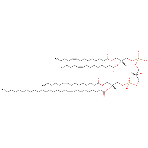 | YMDB09022 | CL(14:1(9Z)/14:1(9Z)/15:1(11Z)/23:1(9Z)) | [(2R)-2,3-bis[(9Z)-tetradec-9-enoyloxy]propoxy][(2R)-2-hydroxy-3-({hydroxy[(2R)-3-[(11Z)-pentadec-11-enoyloxy]-2-[(9Z)-tricos-9-enoyloxy]propoxy]phosphoryl}oxy)propoxy]phosphinic acid | C75H138O17P2 1373.86 | |