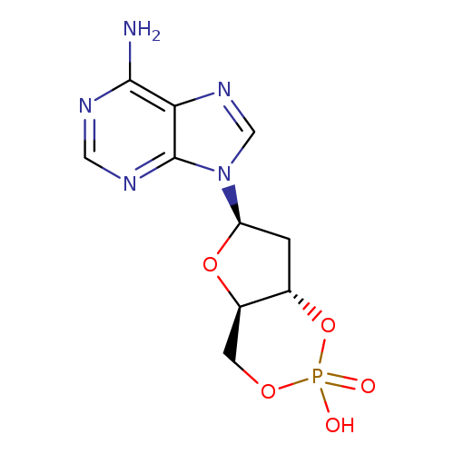 | YMDB00452 | 3',5'-cyclic dAMP 13342-50-2 | (4aR,6R,7aS)-6-(6-amino-9H-purin-9-yl)-2-hydroxy-hexahydro-2λ⁵-furo[3,2-d][1,3,2]dioxaphosphinin-2-one | C10H12N5O5P 313.2065 | |