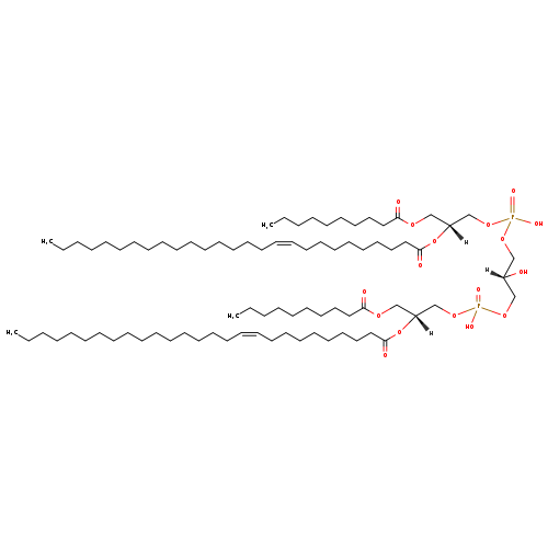| YMDB04698 | CL(10:0/26:1(9Z)/10:0/26:1(9Z)) | [(2R)-3-(decanoyloxy)-2-[(10Z)-heptacos-10-enoyloxy]propoxy][3-({[(2R)-3-(decanoyloxy)-2-[(10Z)-heptacos-10-enoyloxy]propoxy](hydroxy)phosphoryl}oxy)-2-hydroxypropoxy]phosphinic acid | C83H158O17P2 1490.108 | |