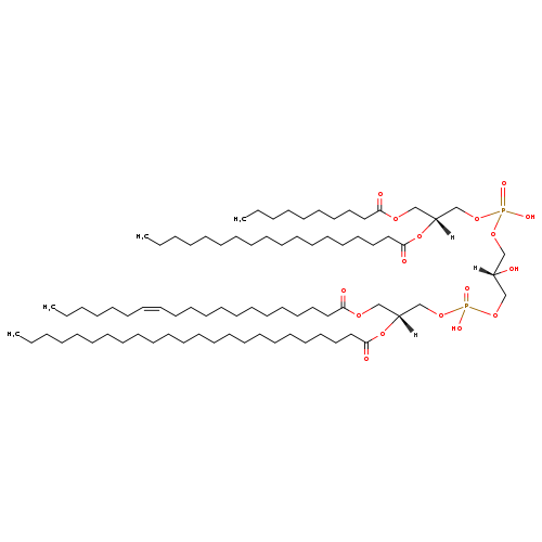 | YMDB04504 | CL(10:0/18:0/20:1(13Z)/24:0) | [(2S)-3-({[(2R)-3-(decanoyloxy)-2-(octadecanoyloxy)propoxy](hydroxy)phosphoryl}oxy)-2-hydroxypropoxy][(2R)-3-[(13Z)-icos-13-enoyloxy]-2-(tetracosanoyloxy)propoxy]phosphinic acid | C81H156O17P2 1464.07 | |