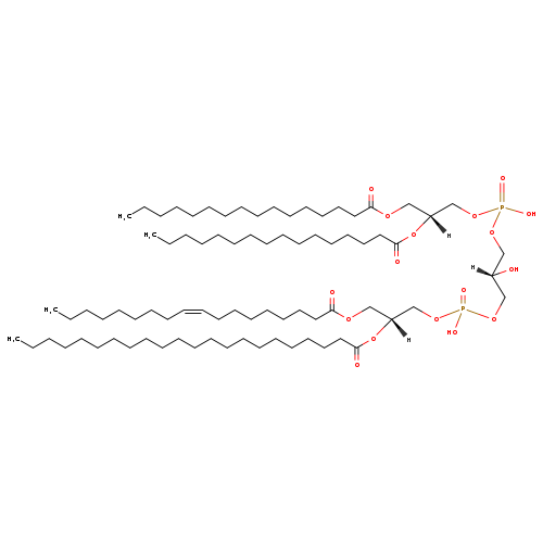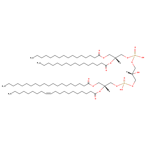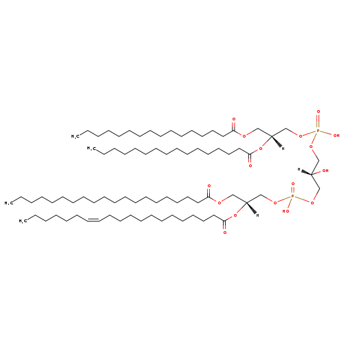 | YMDB06545 | CL(14:0/14:0/14:1(11Z)/30:0) | [(2S)-3-({[(2R)-2,3-bis(tetradecanoyloxy)propoxy](hydroxy)phosphoryl}oxy)-2-hydroxypropoxy][(2R)-3-[(11Z)-tetradec-11-enoyloxy]-2-(triacontanoyloxy)propoxy]phosphinic acid | C81H156O17P2 1464.07 | |