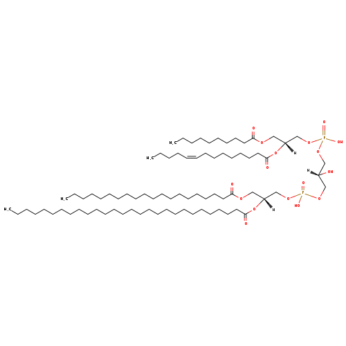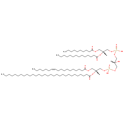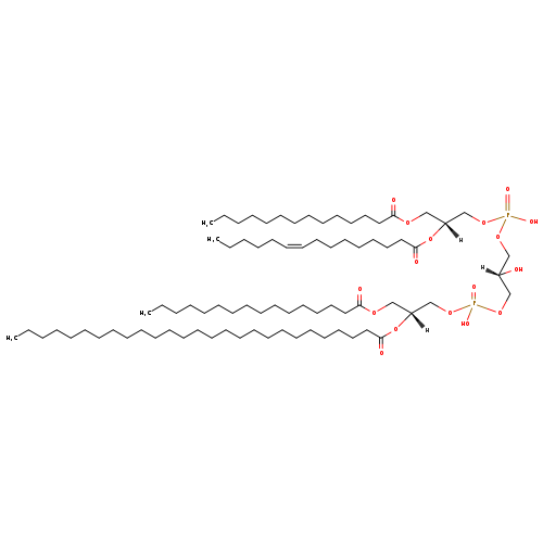 | YMDB06564 | CL(14:0/14:0/14:1(9Z)/30:0) | [(2S)-3-({[(2R)-2,3-bis(tetradecanoyloxy)propoxy](hydroxy)phosphoryl}oxy)-2-hydroxypropoxy][(2R)-3-[(9Z)-tetradec-9-enoyloxy]-2-(triacontanoyloxy)propoxy]phosphinic acid | C81H156O17P2 1464.07 | |