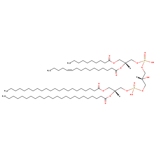 | YMDB04025 | CL(10:0/16:0/16:1(11Z)/30:0) | [(2S)-3-({[(2R)-3-(decanoyloxy)-2-(hexadecanoyloxy)propoxy](hydroxy)phosphoryl}oxy)-2-hydroxypropoxy][(2R)-3-[(11Z)-hexadec-11-enoyloxy]-2-(triacontanoyloxy)propoxy]phosphinic acid | C81H156O17P2 1464.07 | |