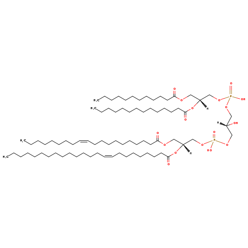 | YMDB07705 | CL(14:0/18:1(11Z)/18:1(11Z)/20:0) | [(2R)-2-hydroxy-3-({hydroxy[(2R)-2-(icosanoyloxy)-3-[(11Z)-octadec-11-enoyloxy]propoxy]phosphoryl}oxy)propoxy][(2R)-2-[(11Z)-octadec-11-enoyloxy]-3-(tetradecanoyloxy)propoxy]phosphinic acid | C79H150O17P2 1434.0 | |