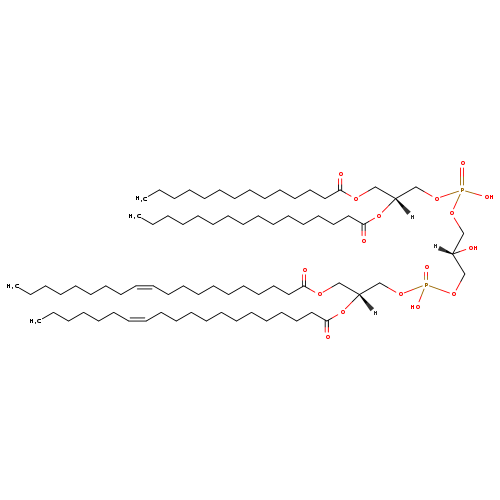 | YMDB07491 | CL(14:0/16:0/20:1(13Z)/20:1(11Z)) | [(2S)-3-({[(2R)-2-(hexadecanoyloxy)-3-(tetradecanoyloxy)propoxy](hydroxy)phosphoryl}oxy)-2-hydroxypropoxy][(2R)-2-[(11Z)-icos-11-enoyloxy]-3-[(13Z)-icos-13-enoyloxy]propoxy]phosphinic acid | C79H150O17P2 1434.0 | |