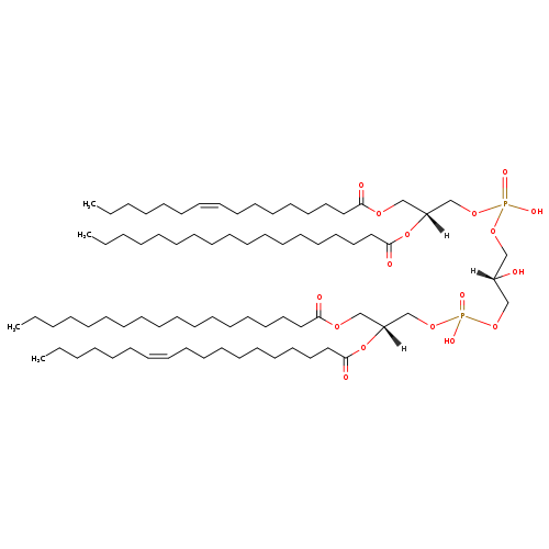| YMDB11340 | CL(16:1(9Z)/18:0/18:0/18:1(9Z)) | [(2S)-3-({[(2R)-3-[(9Z)-hexadec-9-enoyloxy]-2-(octadecanoyloxy)propoxy](hydroxy)phosphoryl}oxy)-2-hydroxypropoxy][(2R)-2-[(9Z)-octadec-9-enoyloxy]-3-(octadecanoyloxy)propoxy]phosphinic acid | C79H150O17P2 1434.0 | |
