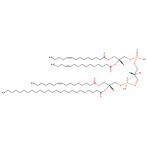 | YMDB09323 | CL(14:1(9Z)/15:1(11Z)/16:1(9Z)/25:0) | [(2R)-3-({[(2R)-3-[(9Z)-hexadec-9-enoyloxy]-2-(pentacosanoyloxy)propoxy](hydroxy)phosphoryl}oxy)-2-hydroxypropoxy][(2R)-2-[(11Z)-pentadec-11-enoyloxy]-3-[(9Z)-tetradec-9-enoyloxy]propoxy]phosphinic acid | C79H148O17P2 1431.984 | |