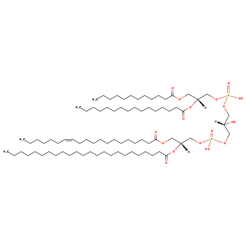 | YMDB06363 | CL(12:0/18:0/18:1(11Z)/24:0) | [(2S)-3-({[(2R)-3-(dodecanoyloxy)-2-(octadecanoyloxy)propoxy](hydroxy)phosphoryl}oxy)-2-hydroxypropoxy][(2R)-3-[(11Z)-octadec-11-enoyloxy]-2-(tetracosanoyloxy)propoxy]phosphinic acid | C81H156O17P2 1464.07 | |