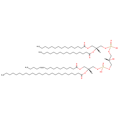| YMDB06610 | CL(14:0/14:0/16:0/28:1(11Z)) | [(2S)-3-({[(2R)-2,3-bis(tetradecanoyloxy)propoxy](hydroxy)phosphoryl}oxy)-2-hydroxypropoxy][(2R)-3-(hexadecanoyloxy)-2-[(12Z)-octacos-12-enoyloxy]propoxy]phosphinic acid | C81H156O17P2 1464.07 | |