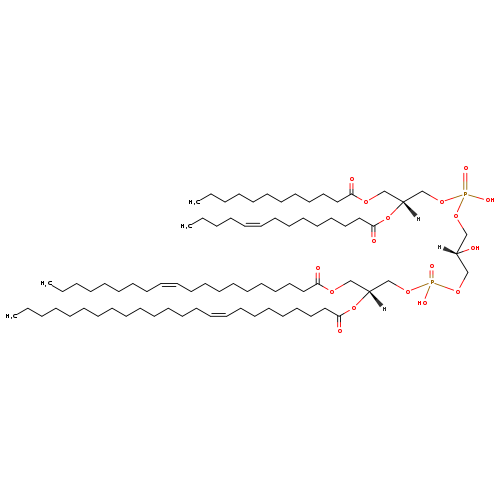 | YMDB08924 | CL(14:1(9Z)/14:1(11Z)/18:0/24:1(9Z)) | [(2S)-2-hydroxy-3-({hydroxy[(2R)-2-[(11Z)-tetradec-11-enoyloxy]-3-[(9Z)-tetradec-9-enoyloxy]propoxy]phosphoryl}oxy)propoxy][(2R)-3-(octadecanoyloxy)-2-[(9Z)-tetracos-9-enoyloxy]propoxy]phosphinic acid | C79H148O17P2 1431.984 | |