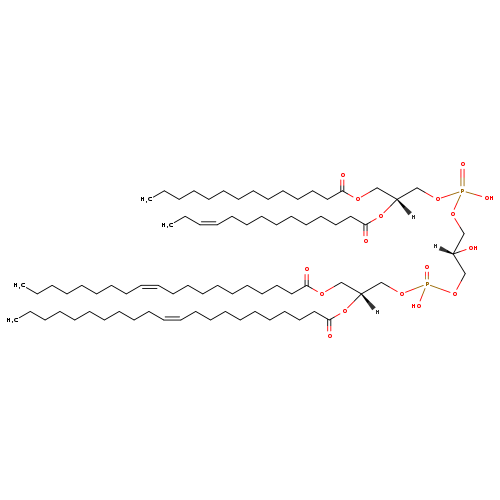 | YMDB06890 | CL(14:0/14:1(11Z)/20:1(11Z)/22:1(9Z)) | [(2R)-2-[(9Z)-docos-9-enoyloxy]-3-[(11Z)-icos-11-enoyloxy]propoxy][(2S)-2-hydroxy-3-({hydroxy[(2R)-2-[(11Z)-tetradec-11-enoyloxy]-3-(tetradecanoyloxy)propoxy]phosphoryl}oxy)propoxy]phosphinic acid | C79H148O17P2 1431.984 | |