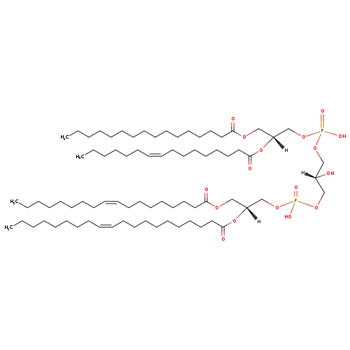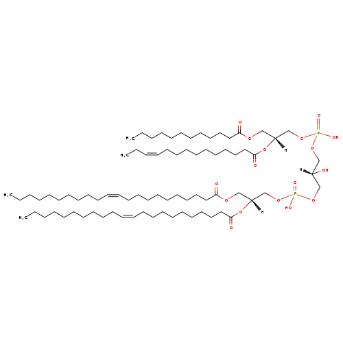| YMDB09739 | CL(14:1(9Z)/18:0/18:1(9Z)/20:1(11Z)) | [(2S)-2-hydroxy-3-({hydroxy[(2R)-2-(octadecanoyloxy)-3-[(9Z)-tetradec-9-enoyloxy]propoxy]phosphoryl}oxy)propoxy][(2R)-2-[(11Z)-icos-11-enoyloxy]-3-[(9Z)-octadec-9-enoyloxy]propoxy]phosphinic acid | C79H148O17P2 1431.984 | |