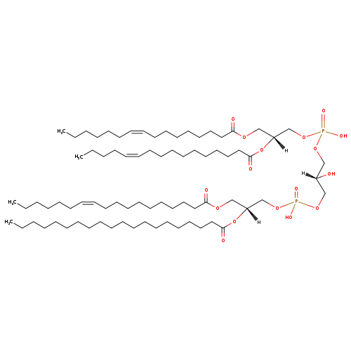 | YMDB09992 | CL(15:0/15:1(11Z)/16:1(11Z)/24:1(9Z)) | [(2R)-3-[(11Z)-hexadec-11-enoyloxy]-2-[(9Z)-tetracos-9-enoyloxy]propoxy][(2S)-2-hydroxy-3-({hydroxy[(2R)-2-[(11Z)-pentadec-11-enoyloxy]-3-(pentadecanoyloxy)propoxy]phosphoryl}oxy)propoxy]phosphinic acid | C79H148O17P2 1431.984 | |