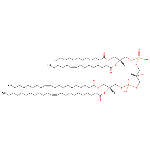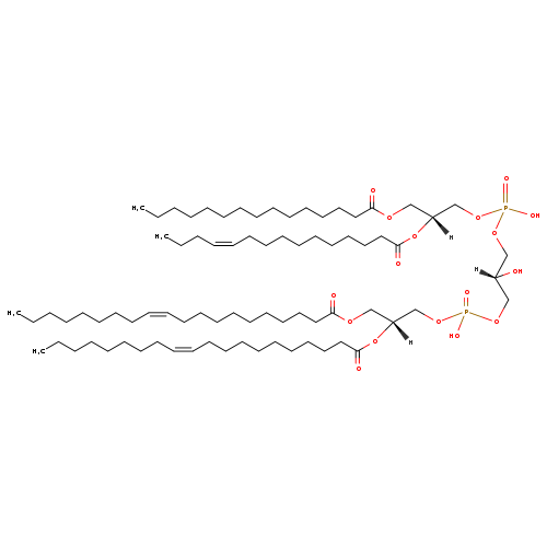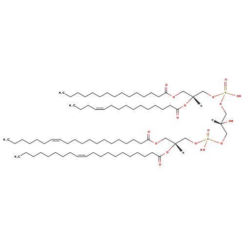 | YMDB09792 | CL(14:1(9Z)/18:1(9Z)/18:1(9Z)/20:0) | [(2R)-2-hydroxy-3-({hydroxy[(2R)-2-(icosanoyloxy)-3-[(9Z)-octadec-9-enoyloxy]propoxy]phosphoryl}oxy)propoxy][(2R)-2-[(9Z)-octadec-9-enoyloxy]-3-[(9Z)-tetradec-9-enoyloxy]propoxy]phosphinic acid | C79H148O17P2 1431.984 | |