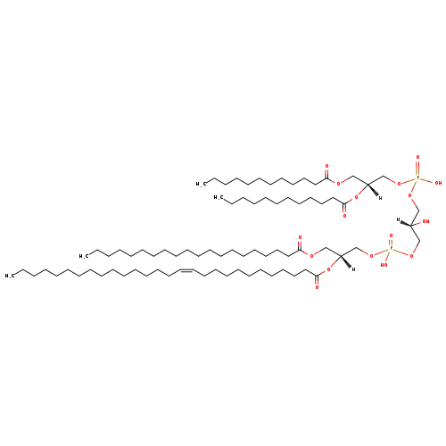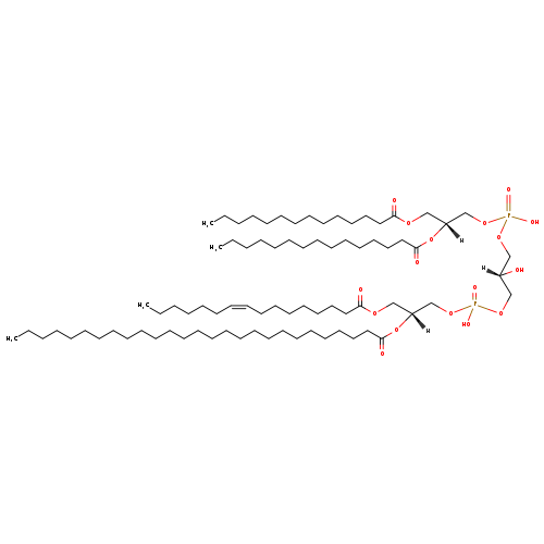 | YMDB06671 | CL(14:0/14:0/18:1(11Z)/26:0) | [(2S)-3-({[(2R)-2,3-bis(tetradecanoyloxy)propoxy](hydroxy)phosphoryl}oxy)-2-hydroxypropoxy][(2R)-2-(hexacosanoyloxy)-3-[(11Z)-octadec-11-enoyloxy]propoxy]phosphinic acid | C81H156O17P2 1464.07 | |