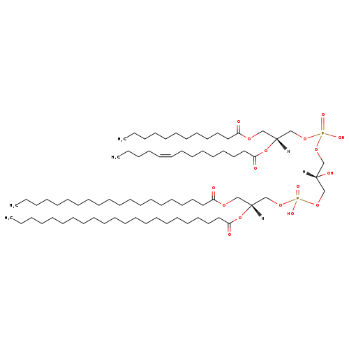 | YMDB06357 | CL(12:0/18:0/18:1(11Z)/20:0) | [(2S)-3-({[(2R)-3-(dodecanoyloxy)-2-(octadecanoyloxy)propoxy](hydroxy)phosphoryl}oxy)-2-hydroxypropoxy][(2R)-2-(icosanoyloxy)-3-[(11Z)-octadec-11-enoyloxy]propoxy]phosphinic acid | C77H148O17P2 1407.962 | |