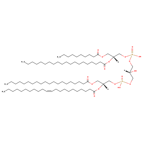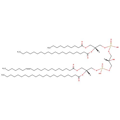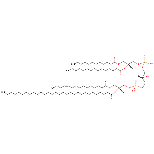 | YMDB07719 | CL(14:0/18:1(11Z)/20:0/20:0) | [(2R)-3-({[(2R)-2,3-bis(icosanoyloxy)propoxy](hydroxy)phosphoryl}oxy)-2-hydroxypropoxy][(2R)-2-[(11Z)-octadec-11-enoyloxy]-3-(tetradecanoyloxy)propoxy]phosphinic acid | C81H156O17P2 1464.07 | |