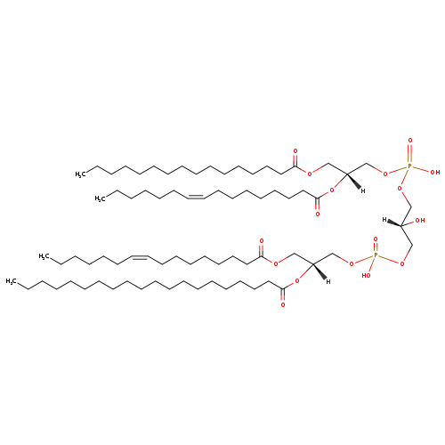 | YMDB08689 | CL(14:1(11Z)/18:0/18:0/18:1(9Z)) | [(2S)-2-hydroxy-3-({hydroxy[(2R)-2-(octadecanoyloxy)-3-[(11Z)-tetradec-11-enoyloxy]propoxy]phosphoryl}oxy)propoxy][(2R)-2-[(9Z)-octadec-9-enoyloxy]-3-(octadecanoyloxy)propoxy]phosphinic acid | C77H146O17P2 1405.946 | |
