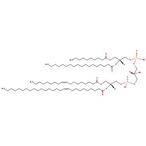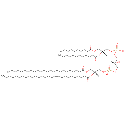 | YMDB02819 | CL(10:0/12:0/24:0/26:1(9Z)) | [(2S)-3-({[(2R)-3-(decanoyloxy)-2-(dodecanoyloxy)propoxy](hydroxy)phosphoryl}oxy)-2-hydroxypropoxy][(2R)-2-[(10Z)-heptacos-10-enoyloxy]-3-(tetracosanoyloxy)propoxy]phosphinic acid | C82H158O17P2 1478.097 | |