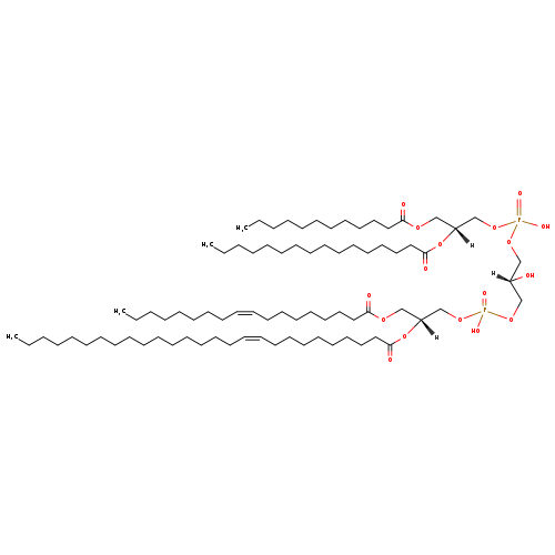 | YMDB06065 | CL(12:0/16:0/18:1(11Z)/26:1(9Z)) | [(2S)-3-({[(2R)-3-(dodecanoyloxy)-2-(hexadecanoyloxy)propoxy](hydroxy)phosphoryl}oxy)-2-hydroxypropoxy][(2R)-2-[(10Z)-heptacos-10-enoyloxy]-3-[(11Z)-octadec-11-enoyloxy]propoxy]phosphinic acid | C82H156O17P2 1476.081 | |