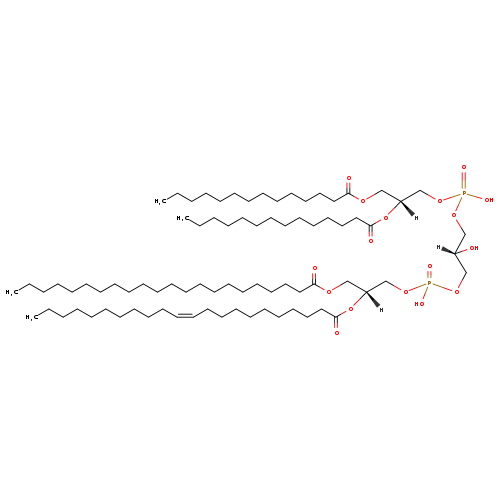 | YMDB06697 | CL(14:0/14:0/20:1(11Z)/24:0) | [(2S)-3-({[(2R)-2,3-bis(tetradecanoyloxy)propoxy](hydroxy)phosphoryl}oxy)-2-hydroxypropoxy][(2R)-3-[(11Z)-icos-11-enoyloxy]-2-(tetracosanoyloxy)propoxy]phosphinic acid | C81H156O17P2 1464.07 | |