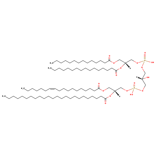 | YMDB07466 | CL(14:0/16:0/18:1(11Z)/24:0) | [(2S)-3-({[(2R)-2-(hexadecanoyloxy)-3-(tetradecanoyloxy)propoxy](hydroxy)phosphoryl}oxy)-2-hydroxypropoxy][(2R)-3-[(11Z)-octadec-11-enoyloxy]-2-(tetracosanoyloxy)propoxy]phosphinic acid | C81H156O17P2 1464.07 | |