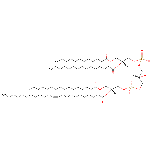 | YMDB04953 | CL(12:0/14:0/14:0/26:1(11Z)) | [(2S)-3-({[(2R)-3-(dodecanoyloxy)-2-(tetradecanoyloxy)propoxy](hydroxy)phosphoryl}oxy)-2-hydroxypropoxy][(2R)-2-[(12Z)-hexacos-12-enoyloxy]-3-(tetradecanoyloxy)propoxy]phosphinic acid | C75H144O17P2 1379.908 |