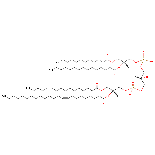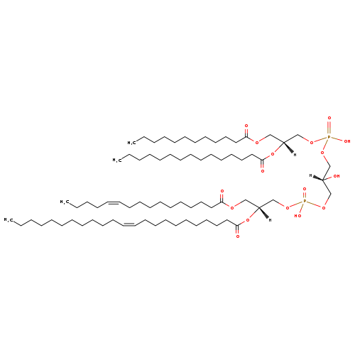 | YMDB05439 | CL(12:0/14:1(9Z)/15:0/25:1(11Z)) | [(2R)-3-(dodecanoyloxy)-2-[(9Z)-tetradec-9-enoyloxy]propoxy][(2R)-2-hydroxy-3-({hydroxy[(2R)-2-[(11Z)-pentacos-11-enoyloxy]-3-(pentadecanoyloxy)propoxy]phosphoryl}oxy)propoxy]phosphinic acid | C75H142O17P2 1377.892 | |