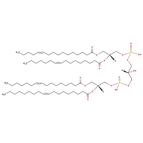 | YMDB08571 | CL(14:1(11Z)/16:1(11Z)/18:1(9Z)/18:1(9Z)) | [(2R)-2,3-bis[(9Z)-octadec-9-enoyloxy]propoxy][(2S)-3-({[(2R)-2-[(11Z)-hexadec-11-enoyloxy]-3-[(11Z)-tetradec-11-enoyloxy]propoxy](hydroxy)phosphoryl}oxy)-2-hydroxypropoxy]phosphinic acid | C75H138O17P2 1373.86 | |