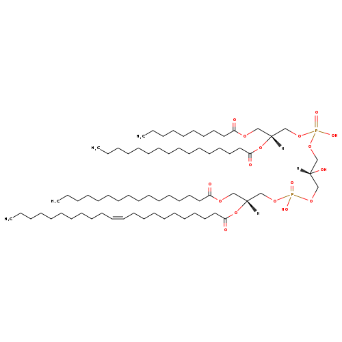 | YMDB02710 | CL(10:0/12:0/18:1(9Z)/24:0) | [(2S)-3-({[(2R)-3-(decanoyloxy)-2-(dodecanoyloxy)propoxy](hydroxy)phosphoryl}oxy)-2-hydroxypropoxy][(2R)-3-[(9Z)-octadec-9-enoyloxy]-2-(tetracosanoyloxy)propoxy]phosphinic acid | C73H140O17P2 1351.854 | |