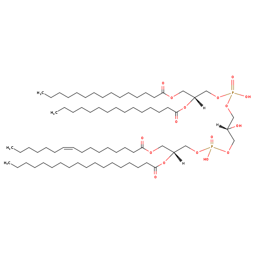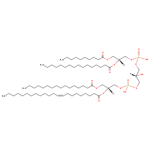 | YMDB06039 | CL(12:0/16:0/18:0/18:1(9Z)) | [(2S)-3-({[(2R)-3-(dodecanoyloxy)-2-(hexadecanoyloxy)propoxy](hydroxy)phosphoryl}oxy)-2-hydroxypropoxy][(2R)-2-[(9Z)-octadec-9-enoyloxy]-3-(octadecanoyloxy)propoxy]phosphinic acid | C73H140O17P2 1351.854 | |