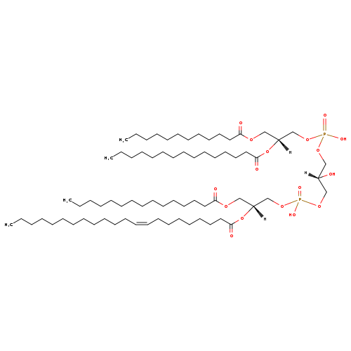 | YMDB06649 | CL(14:0/14:0/18:0/18:1(9Z)) | [(2S)-3-({[(2R)-2,3-bis(tetradecanoyloxy)propoxy](hydroxy)phosphoryl}oxy)-2-hydroxypropoxy][(2R)-2-[(9Z)-octadec-9-enoyloxy]-3-(octadecanoyloxy)propoxy]phosphinic acid | C73H140O17P2 1351.854 | |
