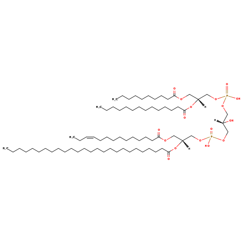 | YMDB02610 | CL(10:0/12:0/15:0/27:1(11Z)) | [(2S)-3-({[(2R)-3-(decanoyloxy)-2-(dodecanoyloxy)propoxy](hydroxy)phosphoryl}oxy)-2-hydroxypropoxy][(2R)-2-[(11Z)-heptacos-11-enoyloxy]-3-(pentadecanoyloxy)propoxy]phosphinic acid | C73H140O17P2 1351.854 | |