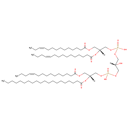 | YMDB06936 | CL(14:0/14:1(9Z)/14:1(9Z)/22:1(9Z)) | [(2R)-2-[(9Z)-docos-9-enoyloxy]-3-[(9Z)-tetradec-9-enoyloxy]propoxy][(2S)-2-hydroxy-3-({hydroxy[(2R)-2-[(9Z)-tetradec-9-enoyloxy]-3-(tetradecanoyloxy)propoxy]phosphoryl}oxy)propoxy]phosphinic acid | C73H136O17P2 1347.822 | |