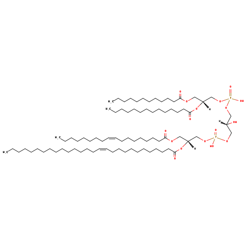 | YMDB09733 | CL(14:1(9Z)/18:0/18:1(11Z)/22:0) | [(2R)-3-({[(2R)-2-(docosanoyloxy)-3-[(11Z)-octadec-11-enoyloxy]propoxy](hydroxy)phosphoryl}oxy)-2-hydroxypropoxy][(2R)-2-(octadecanoyloxy)-3-[(9Z)-tetradec-9-enoyloxy]propoxy]phosphinic acid | C81H154O17P2 1462.054 | |