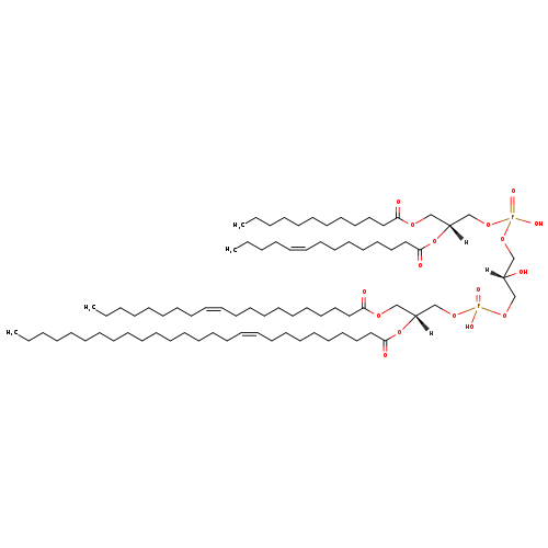 | YMDB05594 | CL(12:0/14:1(9Z)/20:1(11Z)/26:1(9Z)) | [(2R)-3-(dodecanoyloxy)-2-[(9Z)-tetradec-9-enoyloxy]propoxy][(2R)-3-({[(2R)-2-[(10Z)-heptacos-10-enoyloxy]-3-[(11Z)-icos-11-enoyloxy]propoxy](hydroxy)phosphoryl}oxy)-2-hydroxypropoxy]phosphinic acid | C82H154O17P2 1474.065 | |