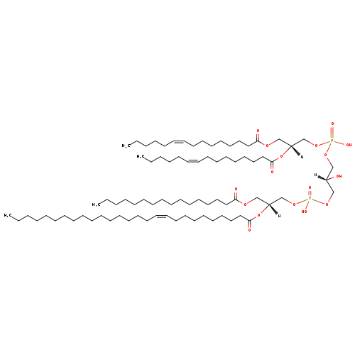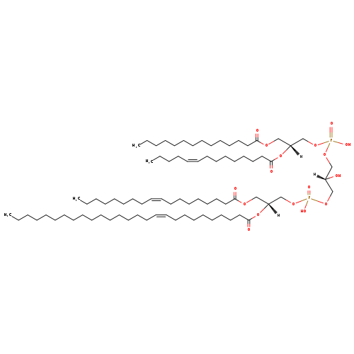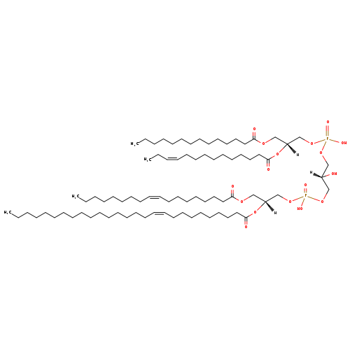 | YMDB06876 | CL(14:0/14:1(11Z)/18:1(9Z)/26:1(9Z)) | [(2R)-2-[(10Z)-heptacos-10-enoyloxy]-3-[(9Z)-octadec-9-enoyloxy]propoxy][(2S)-2-hydroxy-3-({hydroxy[(2R)-2-[(11Z)-tetradec-11-enoyloxy]-3-(tetradecanoyloxy)propoxy]phosphoryl}oxy)propoxy]phosphinic acid | C82H154O17P2 1474.065 | |