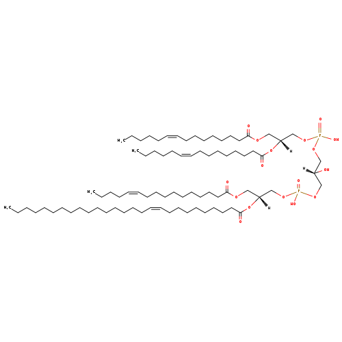 | YMDB09561 | CL(14:1(9Z)/16:1(11Z)/16:1(11Z)/26:1(9Z)) | [(2S)-3-({[(2R)-2-[(10Z)-heptacos-10-enoyloxy]-3-[(11Z)-hexadec-11-enoyloxy]propoxy](hydroxy)phosphoryl}oxy)-2-hydroxypropoxy][(2R)-2-[(11Z)-hexadec-11-enoyloxy]-3-[(9Z)-tetradec-9-enoyloxy]propoxy]phosphinic acid | C82H152O17P2 1472.049 | |
