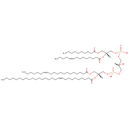 | YMDB04558 | CL(10:0/18:1(11Z)/20:1(11Z)/24:1(9Z)) | [(2S)-3-({[(2R)-3-(decanoyloxy)-2-[(11Z)-octadec-11-enoyloxy]propoxy](hydroxy)phosphoryl}oxy)-2-hydroxypropoxy][(2R)-3-[(11Z)-icos-11-enoyloxy]-2-[(9Z)-tetracos-9-enoyloxy]propoxy]phosphinic acid | C81H152O17P2 1460.038 | |