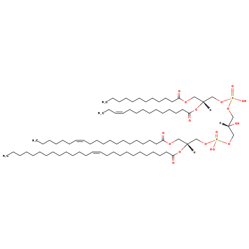 | YMDB08711 | CL(14:1(11Z)/18:0/18:1(9Z)/22:1(9Z)) | [(2R)-2-[(9Z)-docos-9-enoyloxy]-3-[(9Z)-octadec-9-enoyloxy]propoxy][(2S)-2-hydroxy-3-({hydroxy[(2R)-2-(octadecanoyloxy)-3-[(11Z)-tetradec-11-enoyloxy]propoxy]phosphoryl}oxy)propoxy]phosphinic acid | C81H152O17P2 1460.038 | |