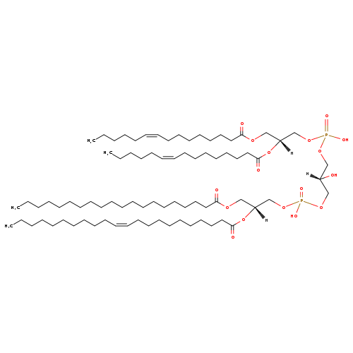 | YMDB09734 | CL(14:1(9Z)/18:0/18:1(11Z)/22:1(11Z)) | [(2R)-3-({[(2R)-2-[(11Z)-docos-11-enoyloxy]-3-[(11Z)-octadec-11-enoyloxy]propoxy](hydroxy)phosphoryl}oxy)-2-hydroxypropoxy][(2R)-2-(octadecanoyloxy)-3-[(9Z)-tetradec-9-enoyloxy]propoxy]phosphinic acid | C81H152O17P2 1460.038 | |