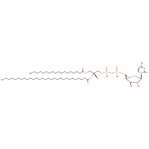 | YMDB12505 | CDP-DG(20:0/27:1(9Z)) | {[(2R,3R,5R)-5-(4-amino-2-oxo-1,2-dihydropyrimidin-1-yl)-3,4-dihydroxyoxolan-2-yl]methoxy}({[(2R)-2-[(9Z)-heptacos-9-enoyloxy]-3-(icosanoyloxy)propoxy](hydroxy)phosphoryl}oxy)phosphinic acid | C59H109N3O15P2 1162.475 | |