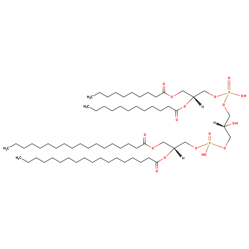 | YMDB02405 | CL(10:0/10:0/18:0/20:0) | [(2S)-3-({[(2R)-2,3-bis(decanoyloxy)propoxy](hydroxy)phosphoryl}oxy)-2-hydroxypropoxy][(2R)-2-(icosanoyloxy)-3-(octadecanoyloxy)propoxy]phosphinic acid | C67H130O17P2 1269.708 | |