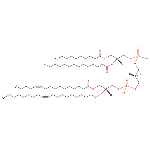 | YMDB03438 | CL(10:0/14:1(9Z)/18:0/18:1(11Z)) | [(2R)-3-(decanoyloxy)-2-[(9Z)-tetradec-9-enoyloxy]propoxy][(2R)-2-hydroxy-3-({hydroxy[(2R)-2-[(11Z)-octadec-11-enoyloxy]-3-(octadecanoyloxy)propoxy]phosphoryl}oxy)propoxy]phosphinic acid | C69H130O17P2 1293.73 | |