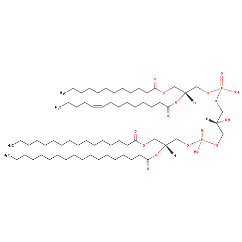 | YMDB05019 | CL(12:0/14:0/16:0/18:0) | [(2S)-3-({[(2R)-3-(dodecanoyloxy)-2-(tetradecanoyloxy)propoxy](hydroxy)phosphoryl}oxy)-2-hydroxypropoxy][(2R)-3-(hexadecanoyloxy)-2-(octadecanoyloxy)propoxy]phosphinic acid | C69H134O17P2 1297.762 | |