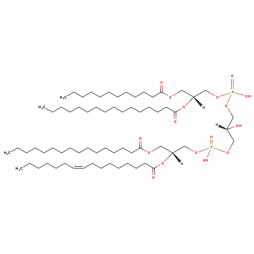 | YMDB07393 | CL(14:0/16:0/14:0/16:0) | [(2R)-2-(hexadecanoyloxy)-3-(tetradecanoyloxy)propoxy][3-({[(2R)-2-(hexadecanoyloxy)-3-(tetradecanoyloxy)propoxy](hydroxy)phosphoryl}oxy)-2-hydroxypropoxy]phosphinic acid | C69H134O17P2 1297.762 | |